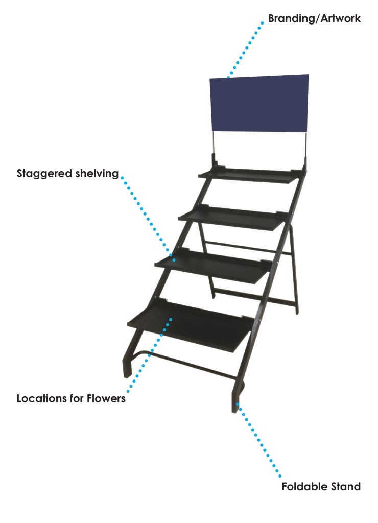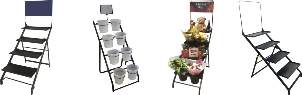 We can design stands for different types of stock including bucket ring displays that hold both square and round buckets, step, flat or tilt shelf displays, hanging basket stands with hooks or much larger staging units for floristry events. Some of our more compact range of stands can be folded down and stacked neatly together offering vital extra space spacing for transport or warehouse/stock room storage.