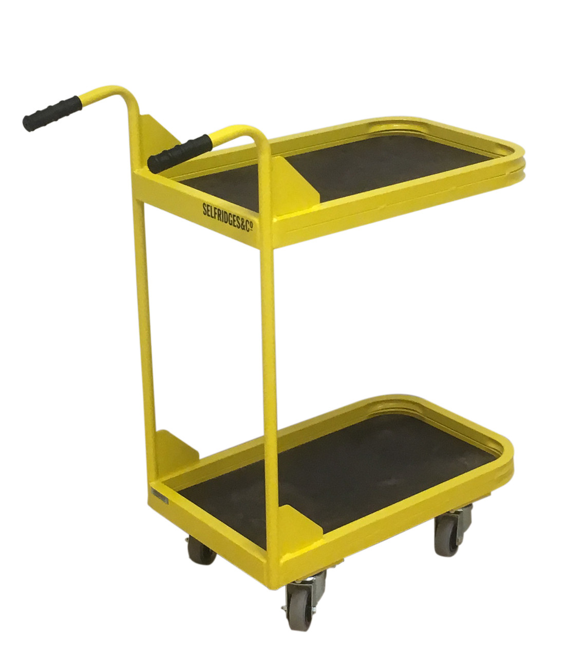This lightweight trolley has non slip shelves, a double handle and lockable wheels and two versatile storage shelves. Can be made in a wide range of powder coat colours.