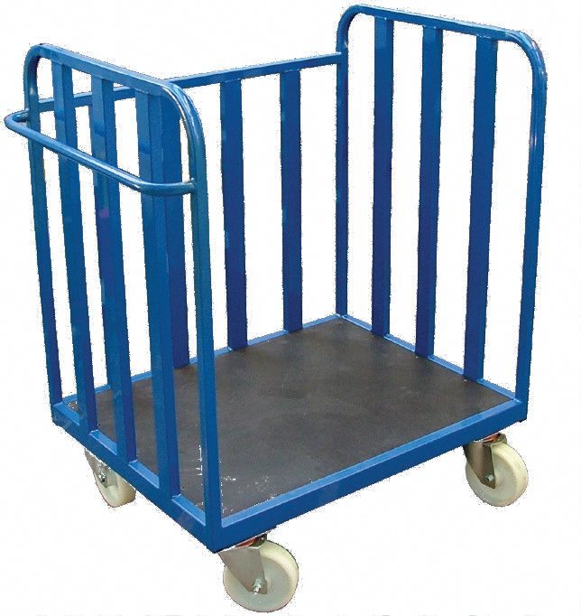 3 sided 2 shelf trolley with an open front. Designed for stacking boxes of stock to move around the workplace.