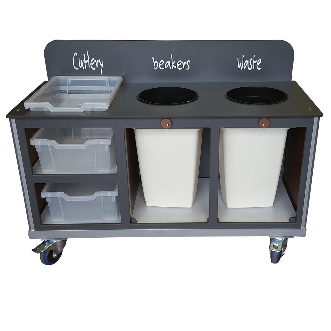 This compact version of our best selling clearing trolleys comes with a double plate or tray space on either end, cupboard doors with catches, locking castor wheels and a tray rest. The whole unit has a wipe clean hygienic finish.