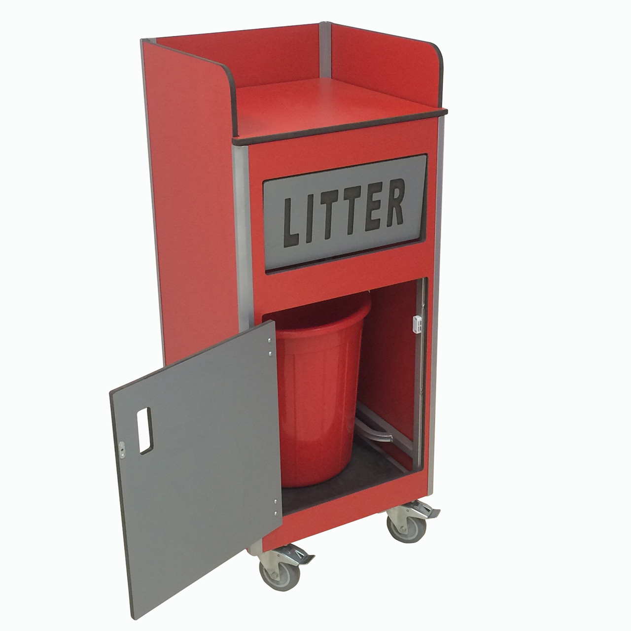 This maxi version of our best selling clearing trolleys comes supplied with all 4 boxes shown and a large bin that can take a bin liner, cupboard doors with catches, locking castor wheels and a tray rest. The whole unit has a wipe clean hygienic finish.
