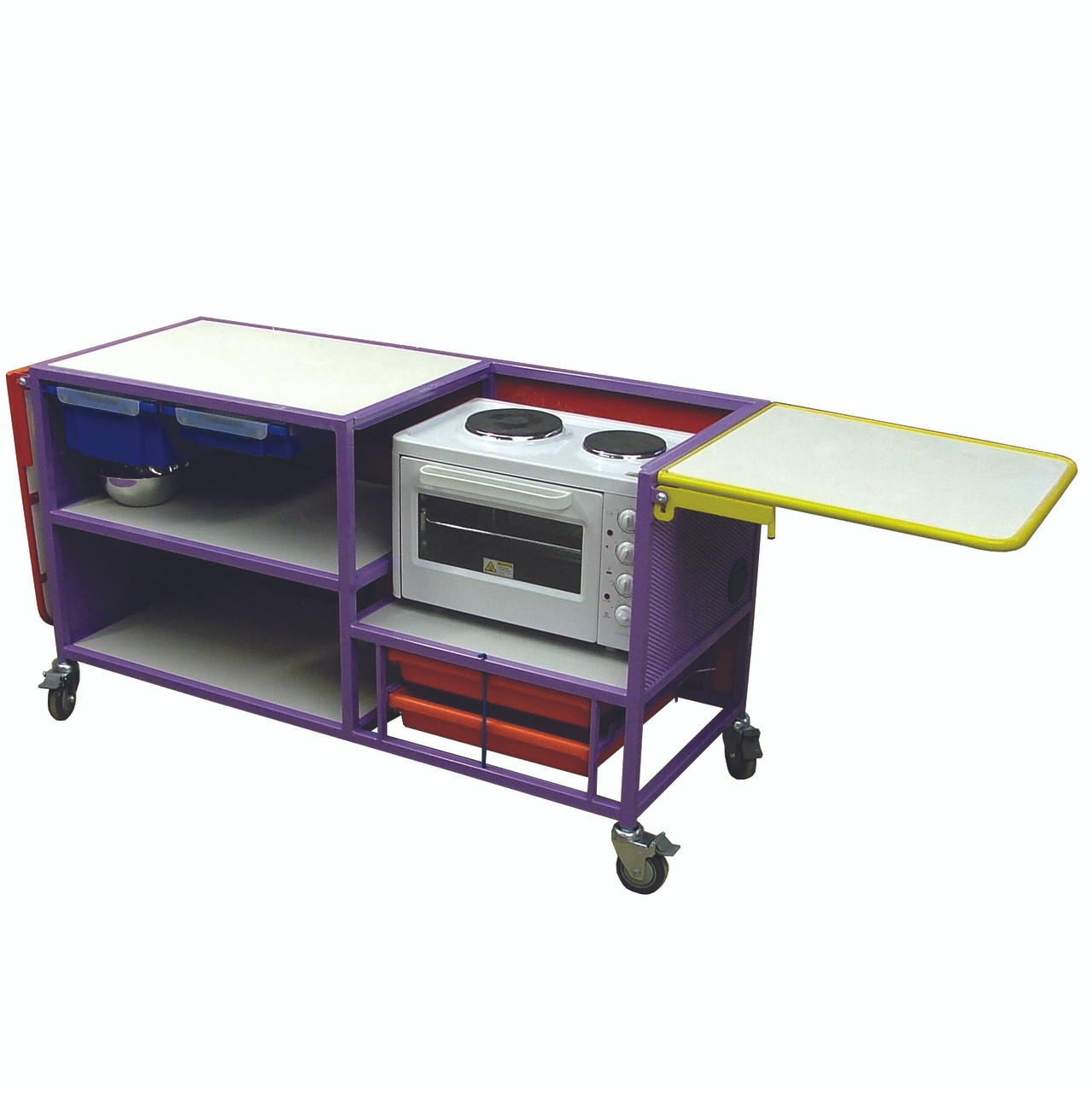 A 4 socket extension is supplied with every unit, the 4 swivel castors all have brakes. There is ample storage behind every trolley for cooking utensils and ingredients.