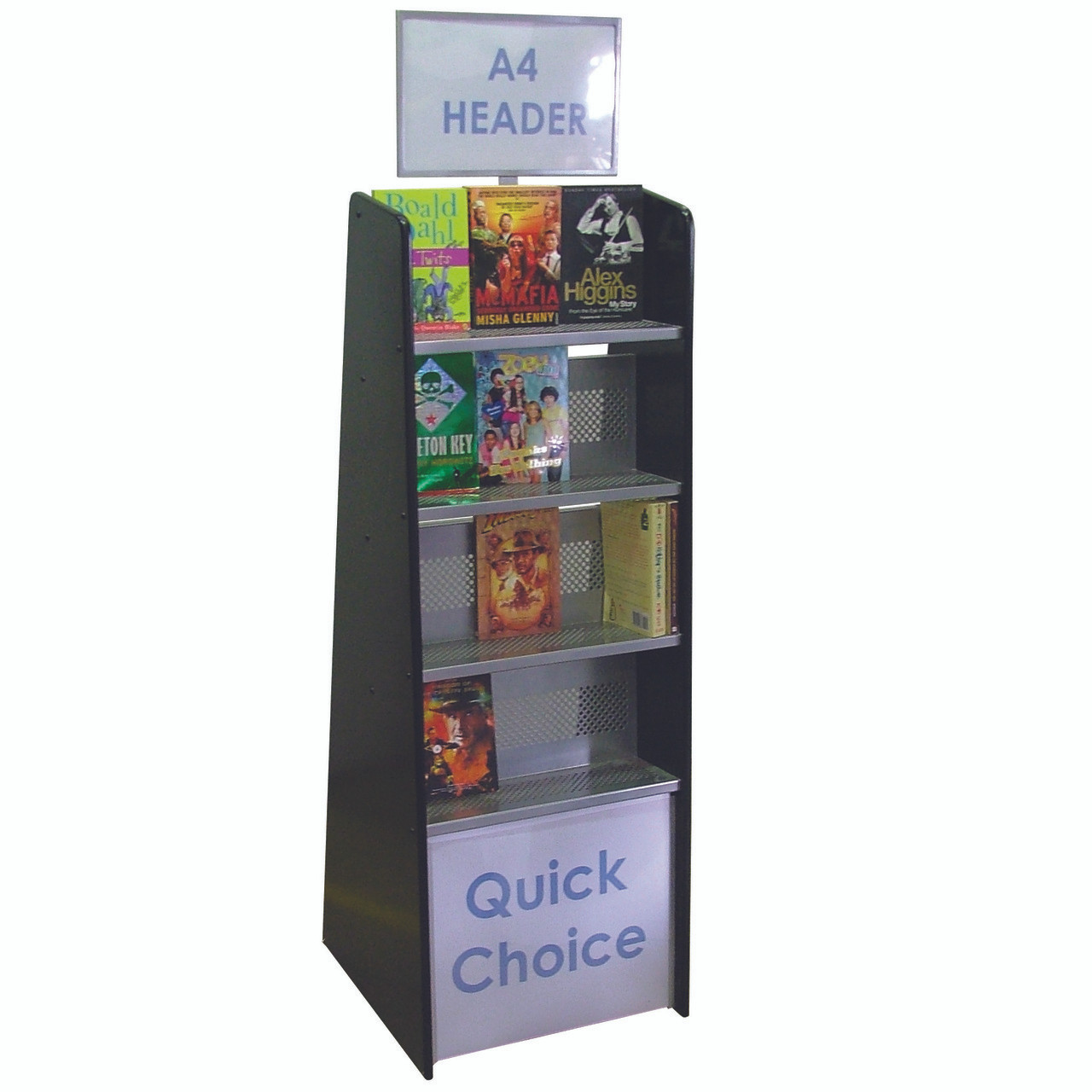 The shelves are completely adjustable and the headers can come in A4 or A3 size as required. All units have 2 wheels on the back to allow them to be wheeled easily into position – even when full!