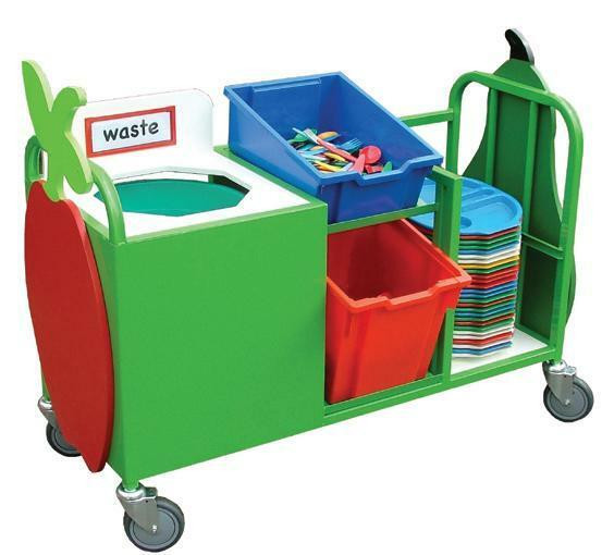 These colourful trolleys encourage the children to clear their trays after use. The work surfaces are made from 12mm thick white plastic which can be lifted out for easy cleaning and is stain resistant.