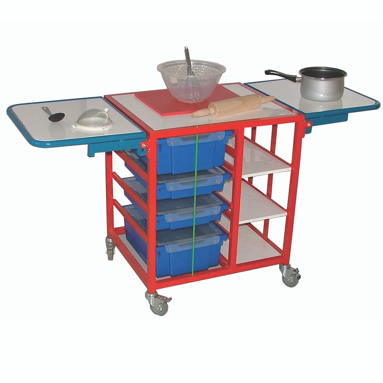 A multi-purpose cooking demonstration trolley complete with castors and foldaway side worktops for ease of movement between areas. Comes with plenty of storage underneath for utensils, trays and pans. Perfect for classrooms or cooking demonstrations. A 4 socket extension is supplied with every unit, the 4 swivel castors all have brakes.