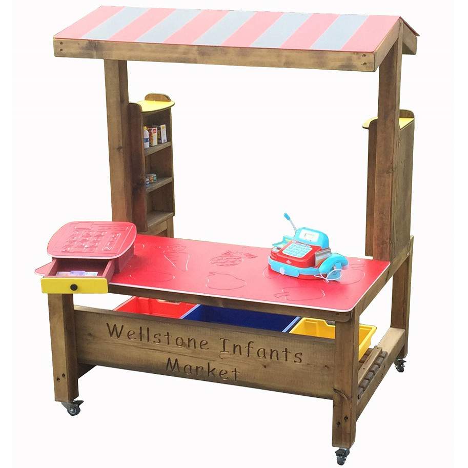 Built to last with treated wood and fade and weather resistant Play-Tec plastic, the mini market can be kept outside in all weathers and is ideal for small gardens. Could also be used for indoor play areas. Comes with child height shelves for stock, locking castor wheels so the unit can be moved and locked in place, a fun striped canopy, a fixed Play-Tec plastic till with drawer (left hand side on image) and worktops.